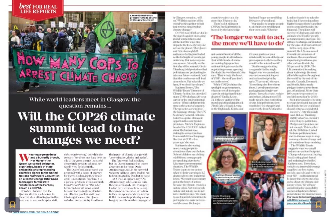 A report for Best magazine about COP26… with expert comment from Emi Leese, co-author of Think Like A Vegan, and Kathryn Brown, director of climate action at The Wildlife Trusts.